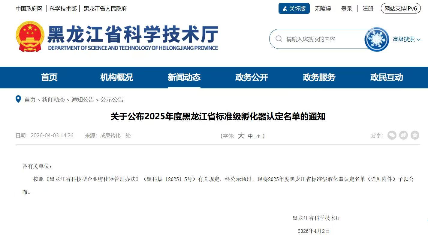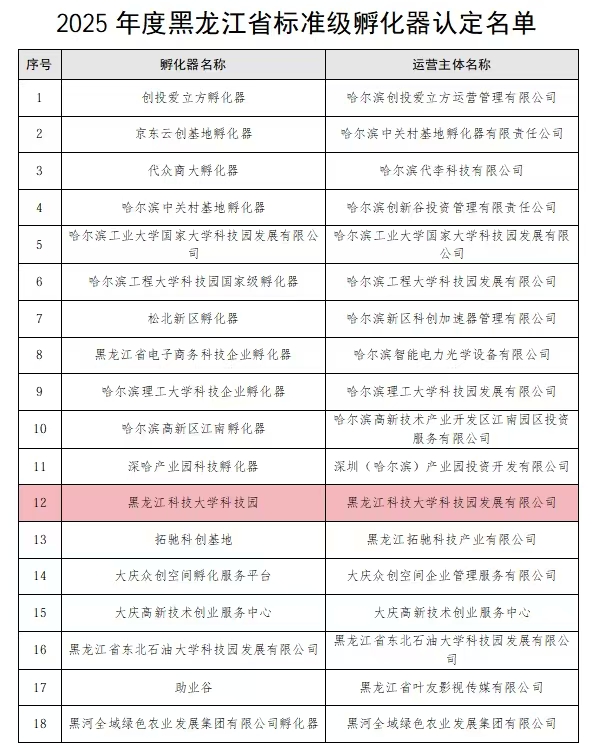 近日,黑龙江省科技厅公布2025年度黑龙江省标准级孵化器认定结果,黑龙江科技大学科技园成功入选,成为我省落实工信部孵化器新标准的首批省级孵化器。
